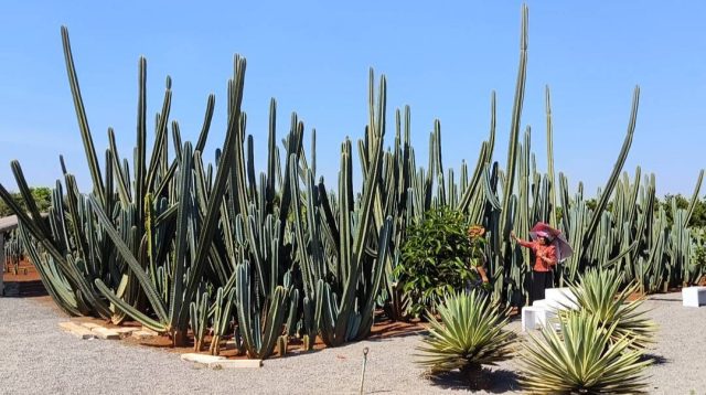 จากความชอบปลูกไว้ชื่นชมเพื่อความสุขกลับกลายขยายสู่ “ไร่วันยังขำ” ตั้งอยู่บ้านมหาราช หมู่ 10 ต.จานใหญ่ อ.กันทรลักษ์ จ.ศรีสะเกษ ที่บริหารงานโดย คุณสุภาวี นิยมวงศ์ อายุ 53 ปี เจ้าของสวนตะบองเพชร ที่ใหญ่ที่สุดใน อ.กันทรลักษ์ และ จ.ศรีสะเกษ ซึ่งปลูกต้นกระบองเพชร เพื่อจำหน่าย และส่งขายผ่านทางออนไลน์ ทั้งในประเทศและต่างประเทศ สร้างรายได้สู่ครอบครัวเดือนละกว่า 2-3 แสนบาท บางต้นปลูกเพียง 3 ปี ลำต้นสูงท่วมหัวกว่า 6 เมตร สร้างความสุดทึ่งให้กับนักท่อเที่ยวที่พบเห็นได้เป็นอย่างดี