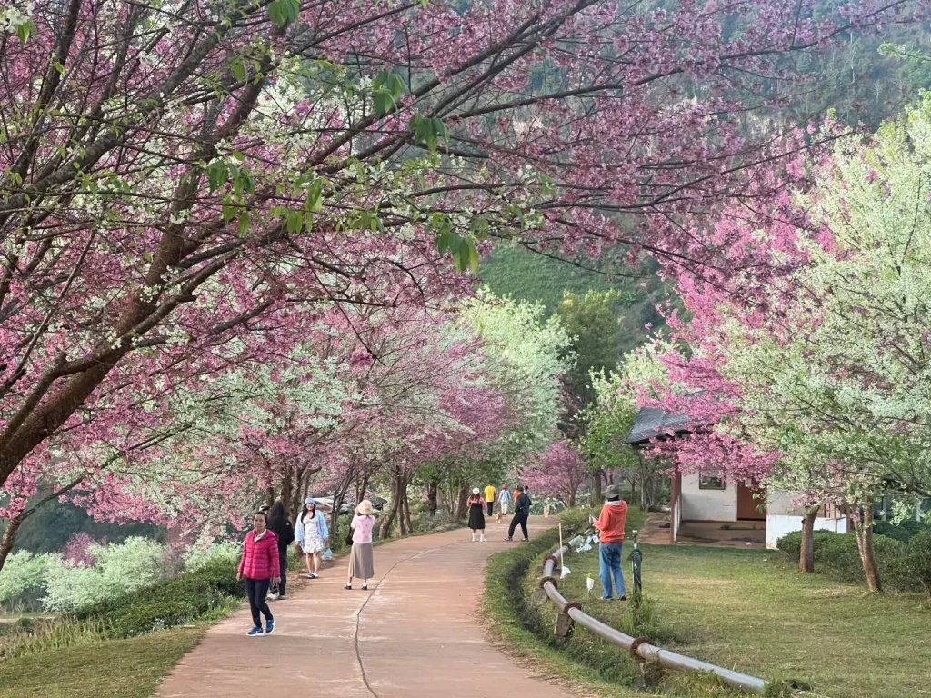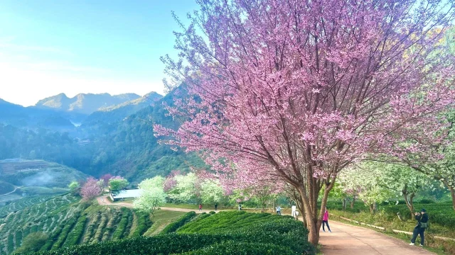 เมื่อวันที่ 22 ม.ค.2567 ผู้สื่อข่าวรายงานว่า บรรยากาศช่วงเช้าบริเวณไร่ชา 2000 ดอยอ่างขาง ที่สถานีเกษตรหลวงอ่างขาง จ.เชียงใหม่ เวลานี้ ดอกพญาเสือโคร่งสีขาวกับดอกพญาเสือโคร่งสีชมพูบานสะพรั่งเต็มที่ 100% ผลิดอกตลอด 2 ข้างทางที่ลงไปยังแปลงชา ซึ่งบางส่วนเริ่มผลิใบ นักท่องเที่ยวสามารถเยี่ยมชมความสวยงามของดอกพญาเสือโคร่งสีขาว สลับชมพู คาดจะมีให้ชมไปจนช่วงปลายเดือน ม.ค. 2567