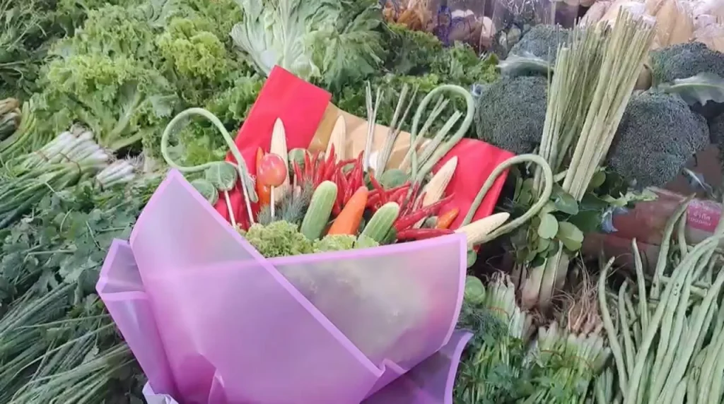 นางสาวชนากานต์ ผันมา อายุ 23 ปี แม่ค้าผักได้เผยว่าโดยปกติร้านของตนก็เปิดขายผักสดอาหารทะเลสดปกติอยู่แล้ว แล้วด้วยที่ว่าใกล้กับเทศกาลวันวาเลนไทน์ในวันพรุ่งนี้ ทางร้านของตนจึงคิดผลิตภัณฑ์ โดยการนำผักสดมาห่อเป็นช่อผักสดขึ้นมา โดยเมื่อเช้าที่ผ่านมาได้มีลูกค้ามาสั่งช่อผักสดกับทางร้าน จำนวน 10 ช่อ ส่วนประโยชน์ของช่อผักสดนั้นก็คือสามารถนำไปทำกับข้าวทานกับครอบครัวกับคนที่รักในวันวาเลนไทน์พรุ่งนี้ได้ และประโยชน์อีกอย่างหนึ่งก็คือในเรื่องของสุขภาพ ส