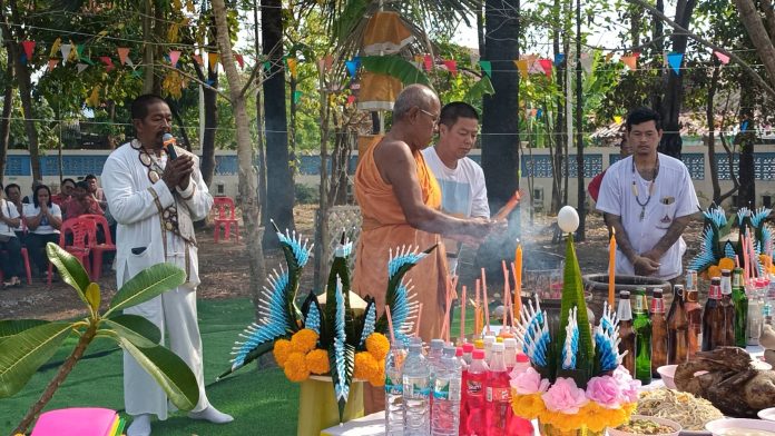 ในพิธีทางสงฆ์มีพระครูอรุณ ธรรมธนาดา เจ้าอาวาสวัด และ ปู่ฤาษีเตโช นาคากะสีนัง ทำพิธีพราหมณ์ มีบรรดาญาติโยมร่วมพิธีมากกว่า 80คน