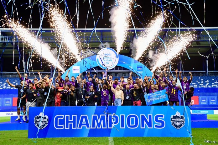 “มาดามแป้ง” นวลพรรณ ล่ำซำ นายกสมาคมกีฬาฟุตบอลแห่งประเทศไทยฯ มอบถ้วยแชมป์ บีจีซี เมืองไทยประกันภัย คัพ 2023/24 ให้แก่ สโมสร พัทลุง เอฟซี พร้อมเงินรางวัล 3 ล้านบาท