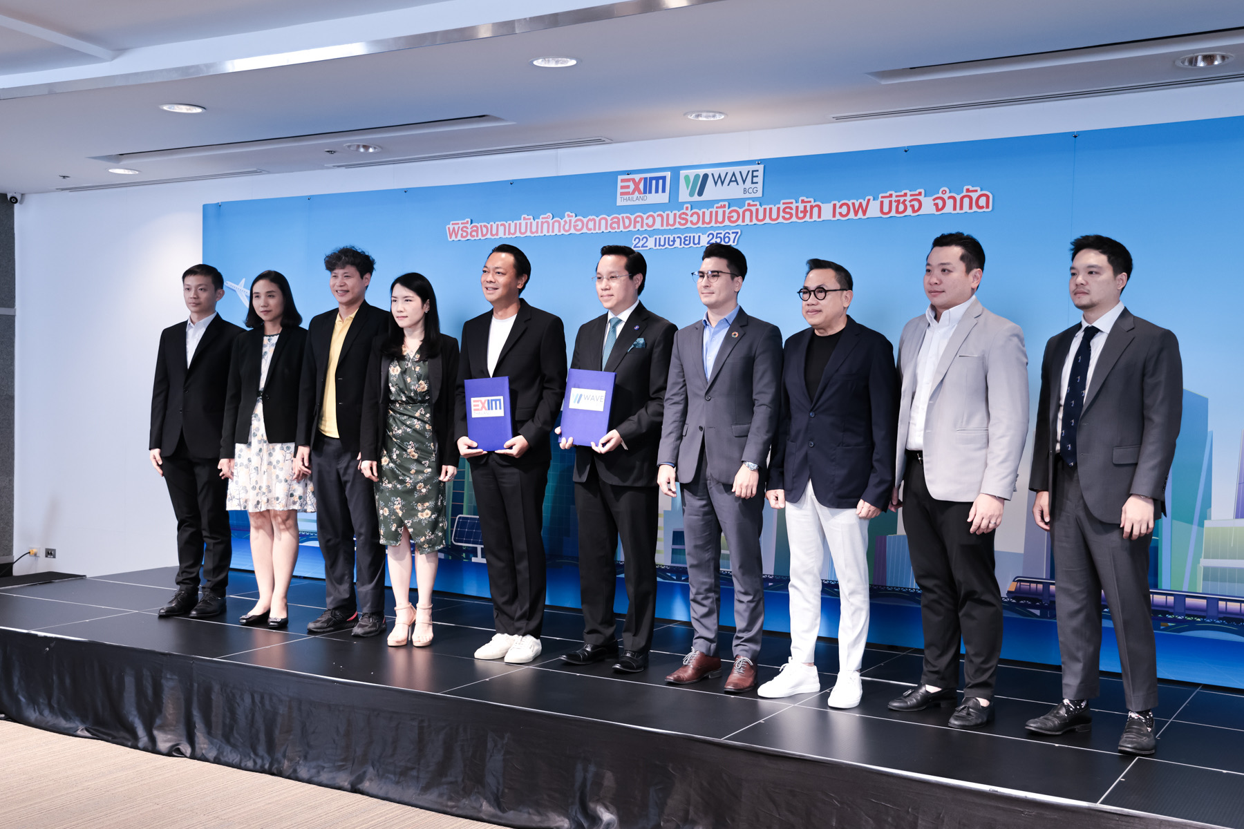 ดร.รักษ์ วรกิจโภคาทร กรรมการผู้จัดการ ธนาคารเพื่อการส่งออกและนําเข้าแห่งประเทศไทย (EXIM BANK) และนายเจมส์ แอนดริว มอร์ ประธานเจ้าหน้าที่บริหาร บริษัท เวฟ บีซีจี จํากัด ลงนามในบนัทึกข้อตกลง ความร่วมมือเพื่อสนับสนุนให้องค์กรต่าง ๆ รวมทัง้ภาคธุรกิจของไทย บรรลุเป้าหมายการลดการปล่อยก๊าซเรือน กระจก โดยใช้กลไกใบรับรองการผลิตไฟฟ้าพลงังานหมุนเวียน (Renewable Energy Certificates : RECs) และ คาร์บอนเครดิต รวมทงั้ส่งเสริมการใช้ทรัพยากรร่วมกันและแบ่งปันความรู้ เพ่ือยกระดบัประสิทธิภาพองค์กรและการ พัฒนาอย่างยั่งยืนในระดับองค์กร ประเทศชาติ และโลกโดยรวม ณ EXIM BANK สํานักงานใหญ่ เมื่อวันที่ 22 เมษายน 2567