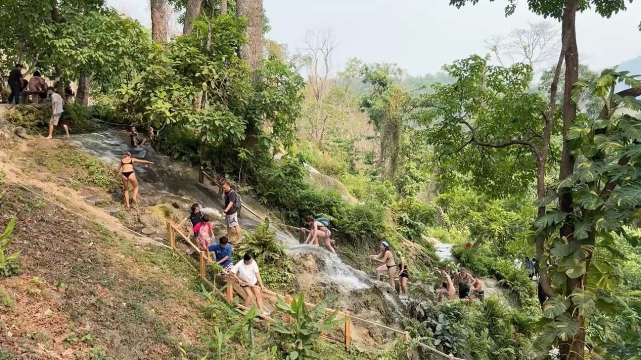 บรรยากาศการท่องเที่ยวของเชียงใหม่ในช่วงที่มีอากาศร้อนจัดที่สุดของปี ทำให้แหล่งท่องเที่ยวทางธรรมชาติหลายแห่งยังคงคึกคัก อย่างที่ อุทยานแห่งชาติน้ำตกบัวตอง-น้ำพุเจ็ดสี อ.แม่แตง จ.เชียงใหม่ พบว่านักท่องเที่ยวนับพันคนเข้าไปท่องเที่ยวกันอย่างไม่ขาดสายในแต่ละวัน มีนักท่องเที่ยวทั้งชาวไทย ชาวต่างชาติจากฝั่งยุโรป และชาวจีน โดยเฉพาะเด็กๆ ชาวไทยที่ตอนนี้อยู่ในช่วงโค้งสุดท้ายของการปิดภาคเรียน ต่างก็สนุกสนานกับการได้เล่นน้ำใสที่ไหลเย็นตลอดทั้งวัน