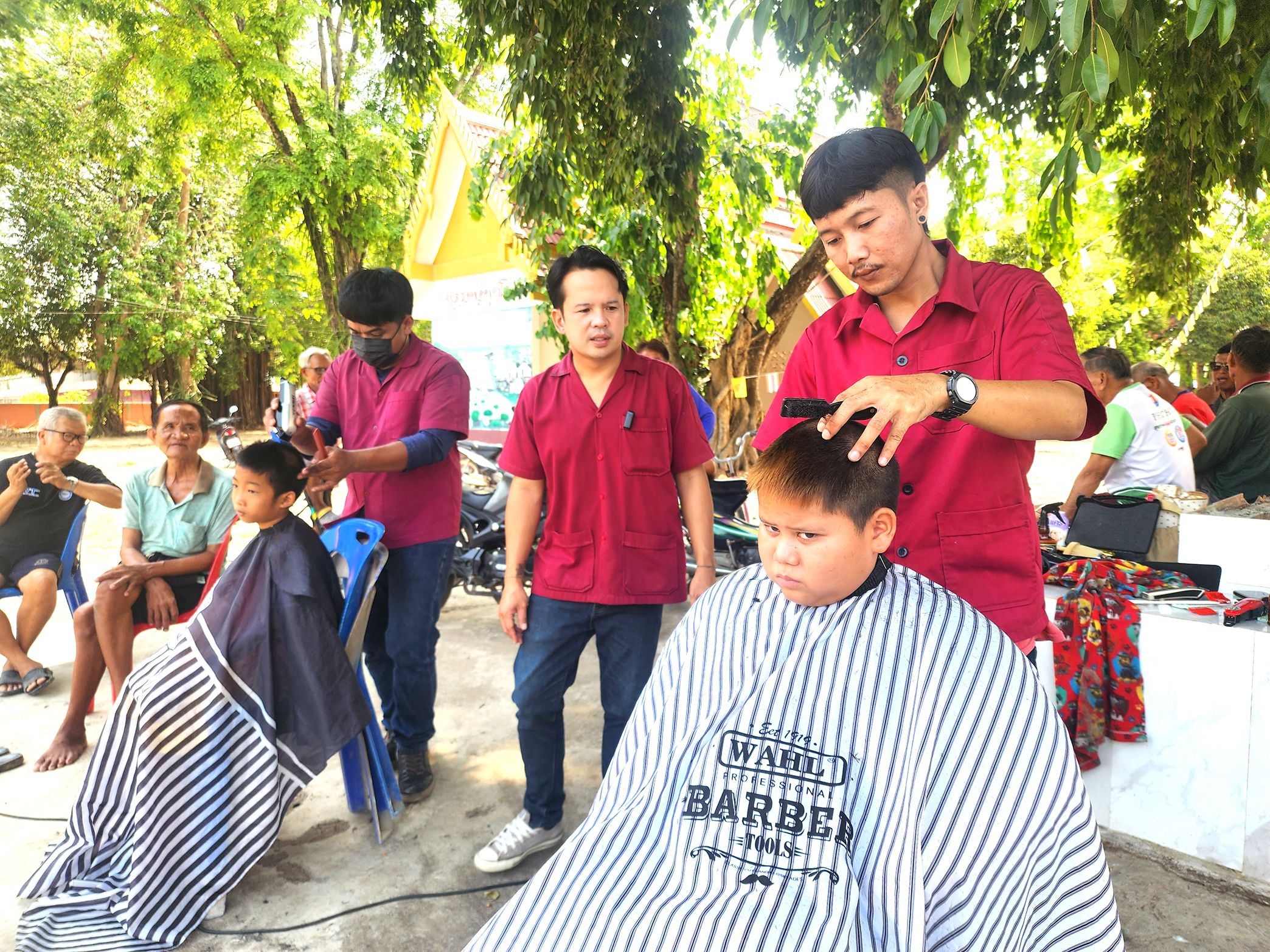 เช่นเดียวกับ ยายจำปา ซึ่งพาหลานชายชื่อ “น้องบู๊ธ”อายุ 3 ขวบ ซึ่งจะเข้าเรียนชั้นเตรียมอนุบาลของศูนย์เด็กเล็กในหมู่บ้าน ก็พาหลานชายมาตัดผมครั้งนี้เป็นครั้งที่ 2 เช่นกัน ซึ่งก็ไม่ต้องเสียเงิน 30-50 บาท หากต้องไปตัดผมที่ตลาด จึงชื่นชอบมากที่มีบริการจิตอาสามาตัดผมฟรีให้ถึงภายในหมู่บ้านแบบนี้