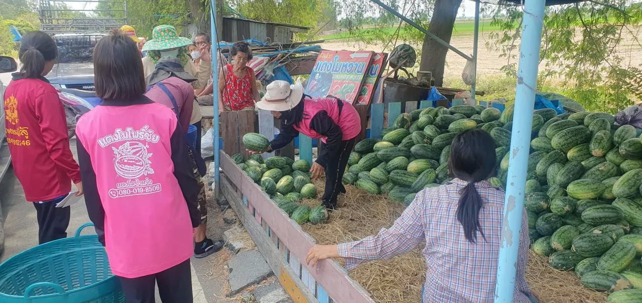 ป้าแจ๋วชาวสิงห์บุรี เจ้าของสวนแตงโมหวานโพธิ์ชัย อาศัยช่วงหน้าร้อนว่างจากการทำนาปรัง ปลูกแตงโมพันธุ์ซอนญ่า พลัส ทัมอัพ และตอร์ปิโด บนที่ 25 ไร่ เพราะเป็นพืชใช้น้ำน้อย โดยวางระบบน้ำหยดให้น้ำและปุ๋ย ทำให้แตงโมมีรสชาติหวาน กรอบอร่อย ขายสร้างรายได้ดี