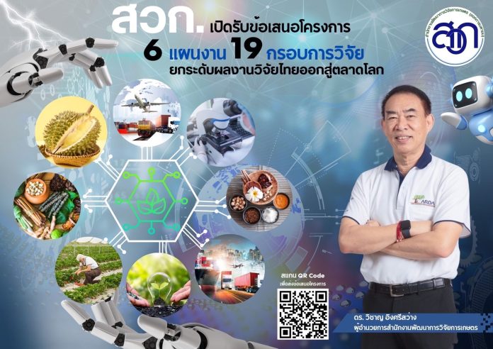 ดร. วิชาญ อิงศรีสว่าง ผู้อำนวยการสำนักงานพัฒนาการวิจัยการเกษตร กล่าวว่า สำนักงานพัฒนาการวิจัยการเกษตร (องค์การมหาชน) หรือ สวก. เป็นหน่วยงานหลักของประเทศในการบริหารการวิจัยการเกษตรเพื่อสร้างความเข้มแข็งของภาคการเกษตรอย่างยั่งยืน โดยมีเป้าหมายผลักดันให้งานวิจัยสามารถนำไปใช้ประโยชน์ได้อย่างเป็นรูปธรรม ด้วยหลักการ “ตลาดนำ นวัตกรรมเสริม เพิ่มรายได้” เพื่อเพิ่มขีดความสามารถในการแข่งขันให้กับภาคการเกษตรไทย นอกจากนี้ สวก. เป็นหนึ่งในหน่วยบริหารจัดการทุนวิจัย (PMU) ในการบริหารงบประมาณวิจัยด้าน ววน. จากสำนักงานคณะกรรมการส่งเสริมวิทยาศาสตร์ วิจัยและนวัตกรรม (สกสว.) โดยได้กำหนดให้ สวก.บริหารจัดการทุนใน 2 ยุทธศาสตร์ ได้แก่ ยุทธศาสตร์ที่ 1 (S1) การพัฒนาเศรษฐกิจไทยด้วยเศรษฐกิจสร้างคุณค่าและเศรษฐกิจสร้างสรรค์ ให้มีความสามารถในการแข่งขัน และพึ่งพาตนเองได้อย่างยั่งยืน พร้อมสู่อนาคต โดยใช้วิทยาศาสตร์ การวิจัย และนวัตกรรม และยุทธศาสตร์ที่ 2 (S2) การยกระดับสังคมและสิ่งแวดล้อม ให้มีการพัฒนาอย่างยั่งยืน สามารถแก้ไขปัญหาท้าทายและปรับตัวได้ทันต่อพลวัตการเปลี่ยนแปลงของโลก โดยใช้วิทยาศาสตร์ การวิจัยและนวัตกรรม