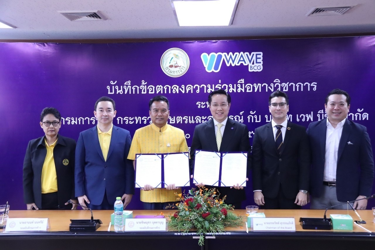 ดร.อรรถวิชช์ สุวรรณภักดี ประธานกรรมการบริษัท เวฟ เอกซ์โพเนนเชียล จำกัด (มหาชน) ร่วมลงนามบันทึกข้อตกลงความร่วมมือ (MOU)ระหว่างกรมการข้าว โดย นายชิษณุชา บุดดาบุญ และ นายอานนท์ นนทรีย์ รองอธิบดีกรมการข้าว และ นายเจมส์ แอนดริว มอร์ ประธานเจ้าหน้าที่บริหาร บริษัท เวฟ บีซีจี จำกัด ซึ่งเป็นบริษัทลูกของ บริษัท เวฟ เอกซ์โพเนนเชียล จำกัด (มหาชน) เพื่อพัฒนานวัตกรรม “ทำนาแบบเปียกสลับแห้ง” และผลิตบุคลากรพัฒนาพันธุ์ข้าว เพื่อลดโลกร้อน และเพิ่มผลผลิตต่อไร่