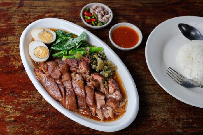 ได้ลองแล้วถึงต้องย้อนถามตัวเองว่า “นานแค่ไหนแล้วที่ไม่ได้กินขาหมูอร่อย ๆ แบบนี้” ขาหมูเน้น ๆ ทั้งเนื้อ หนัง หรือ คากิ เจอกับน้ำจิ้มสูตรเข้มข้นลงตัว ตัดกับรสชาติของขาหมูได้อย่างออกรส แกล้มพริกขี้หนูสดกับกระเทียมที่จัดเต็มแบบไม่หวงของ แถมยังใช้ข้าวสวยที่นุ่มกำลังดี ช่างเป็นช่วงเวลาสุดฟินตั้งแต่คำแรกจนคำสุดท้าย ราคาก็ดีต่อใจ เริ่มต้นสบาย ๆ ที่ 60 บาท