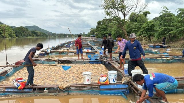 กาญจนบุรี-กำนันเกาะสำโรงเมืองกาญจน์เผยปลาเลี้ยงในกระชังน็อคน้ำตาไปกว่า 250 กระชัง สูญนับ 10 ล้านหลังเจอน้ำแควน้อยหลากอย่างไม่เคยเกิดมาก่อน