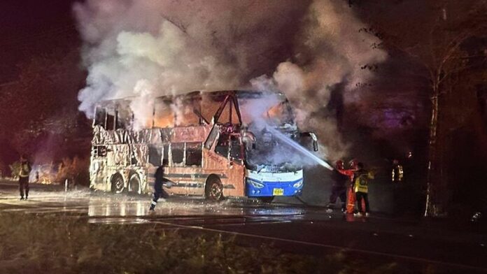 ผู้โดยสารหนีตายระทึก ไฟไหม้รถทัวร์โดยสาร สายกรุงเทพ-เชียงใหม่ เพลิงลุกท่วมทั้งคัน กู้ภัย-ดับเพลิงระดมฉีดน้ำ โชคดีผู้โดยสารปลอดภัยทุกคน