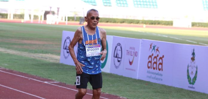 ยกนิ้วโป้ง คุณตาสว่าง จันทร์พราหมณ์ นักกีฬาอายุ 105 ปี จากชมรมกรีฑาผู้สูงอายุจังหวัดชลบุรี คว้า 2 ทอง วิ่ง 100 เมตร และทุ่มน้ำหนัก รุ่นอายุ 100 ปีขึ้นไป ชาย กรีฑา กีฬาสูงอายุนานาชาติ “ไทยแลนด์ โอเพ่น มาสเตอร์เกมส์” ครั้งที่ 5