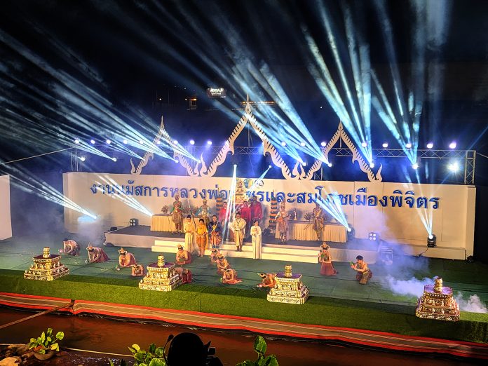 โดยมีการแสดงประกอบพิธีอัญเชิญหลวงพ่อเพชรกลางลำน้ำน่าน บอกเล่าเรื่องราวในประวัติศาสตร์ตั้งแต่ปีพุทธศักราช 2442 ช่วงที่พระยาเทพาธิบดี เจ้าเมืองพิจิตร ได้อัญเชิญหลวงพ่อเพชร กลับจากเมืองพิษณุโลก มาประดิษฐานไว้ที่เมืองพิจิตรใหม่ ณ วัดท่าหลวง เนื่องด้วยชาวเมืองพิจิตรทุกคนมีความโศกเศร้าเสียใจ ที่หลวงพ่อเพชรจะถูกอัญเชิญไปที่วัดเบญจมบพิตร จังหวัดพระนคร ในขณะนั้น พร้อมประกอบพิธีขอขมาและสักการะหลวงพ่อเพชร ซึ่งบรรยากาศเป็นไปอย่างยิ่งใหญ่ตระการตา มีประชาชนให้ความสนใจมาชมความงดงามของประวัติศาสตร์เมืองพิจิตรเป็นจำนวนมาก