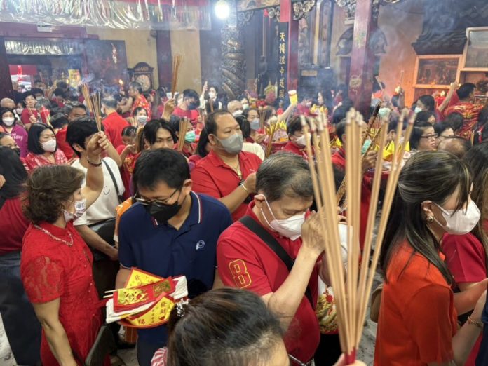ชาวไทยเชื้อสายจีนและนักท่องเที่ยวแห่ไหว้ศาลเจ้าพ่อเสือกันจำนวนมากขอพรเนื่องในวันตรุษจีน ถือเทพเจ้าแห่งความโชคดี การปกป้อง และการคุ้มครองจากสิ่งไม่ดี