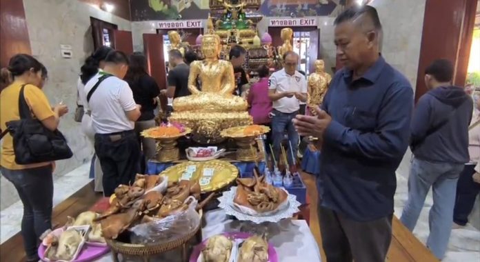 ว่าที่ สจ.นครนายกนำเครื่องไหว้มาแก้บนหลวงพ่อปากแดง พระพุทธรูปศักดิ์สิทธิ์หลังสมความปรารถนาได้รับเลือกตั้ง ขณะเดียวกันนักท่องเที่ยวแห่มาแก้บนขอโชคลาภกันแน่นวัด
