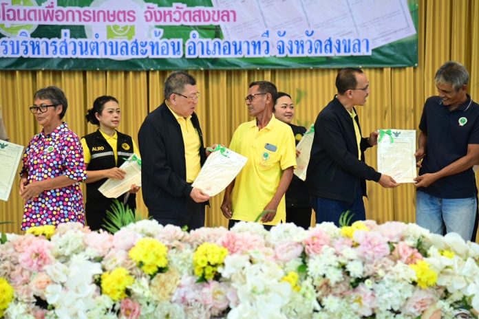 นายอิทธิ ศิริลัทยากร รัฐมนตรีช่วยว่าการกระทรวงเกษตรและสหกรณ์ กล่าวในโอกาสลงพื้นที่ตรวจราชการในพื้นที่จังหวัดสงขลา และมอบโฉนดเพื่อการเกษตรให้กับเกษตรกรในพื้นที่เขตปฏิรูปที่ดินอำเภอนาทวี จังหวัดสงขลา จำนวน 100 ราย พื้นที่รวม 100 แปลง ณ อาคารอเนกประสงค์ องค์การบริหารส่วนตําบลสะท้อน อําเภอนาทวี จังหวัดสงขลา ว่า กระทรวงเกษตรและสหกรณ์ โดยสำนักงานการปฏิรูปที่ดินเพื่อเกษตรกรรม (ส.ป.ก.) ได้สานต่อนโยบายสำคัญในการปรับปรุงเอกสารสิทธิ ส.ป.ก. 4-01 ให้เป็นโฉนดเพื่อการเกษตร ที่จะทำให้พี่น้องเกษตรกรสามารถนำไปต่อยอดในการเข้าถึงโอกาส การให้บริการของภาครัฐ โอกาสการเข้าถึงแหล่งเงินทุนได้เพิ่มมากขึ้น มีทางเลือกในการพัฒนาที่ดินและพัฒนาอาชีพของตนเอง และสร้างคุณภาพชีวิตที่ดีขึ้นอย่างยั่งยืน โดยตั้งเป้าให้ครบ 22 ล้านไร่ทั่วประเทศ ในปี 2568 – 2569