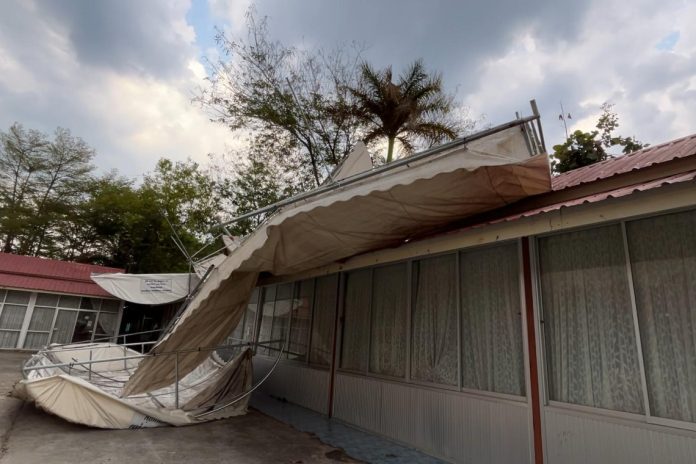 ขอนแก่น-พายุหมุนพัดเต๊นท์ปลิวลอยขึ้นไปค้างบนกุฎิ พระ-ญาติธรรมวิ่งหนีตายอลหม่าน ขณะที่ผู้ใหญ่บ้านลงพื้นที่สำรวจความเสียหายเพื่อรายงานให้อำเภอรับทราบเพื่อเร่งให้การช่วยเหลือ