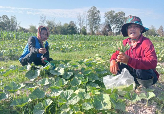 จากการติดตามบรรยากาศการประกอบอาชีพของเกษตรกรชาว จ.กาฬสินธุ์ ในฤดูแล้ง พื้นที่ใช้น้ำชลประทานของโครงการส่งน้ำและบำรุงรักษาลำปาว (เขื่อนลำปาว) หลายอำเภอ ที่นอกจากจะมีการเลี้ยงกุ้งก้ามกรามและทำนาปรังเป็นส่วนใหญ่แล้ว ยังพบว่าในพื้นที่ ต.ลำคลอง ต.ลำปาว และต.บึงวิชัย อ.เมืองกาฬสินธุ์ เกษตรกรได้รวมกลุ่มปลูกพืชผักสวนครัวผสมผสาน ‘แปลงใหญ่’ สร้างร้ายได้ตลอดปี โดยมีการปลูกพืชฤดูแล้ง อายุสั้น ใช้น้ำน้อย อายุ 3-4 เดือนเก็บผลผลิต เช่น พืชกระกูลแตง ฟักทอง บวบ ข้าวโพด ถั่วลิสง พริก มะเขือ ถั่วฝักยาว สามารถเก็บขายได้ทั้งส่วนของยอด ใบ ดอก ผล รายได้อย่างน้อยวันละ 300 บาท ตกเดือนละ 15,000 บาททีเดียว