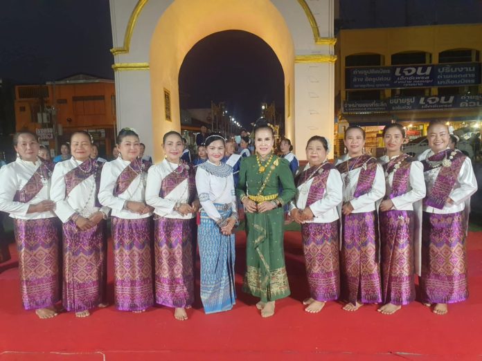 นำทีมโดยครูจันทะสิน กุลภา ผู้นำพาและประดิษฐ์ท่าฟ้อนรำ โดยมีการฟ้อนรำมหาชัย รำคอนสวรรค์ นางรำแต่ละคนต่างก็พร้อมใจ แต่งกายชุดพื้นเมือง เลือกใช้ผ้าทอมือจากท้องถิ่นดินแดนอีสานมาสวมใส่กัน ที่มีเอกลักษณ์ประจำถิ่น ซึ่งปัจจุบันผ้ามัดหมี่แบบไทยๆ ที่มาจากแหล่งผลิตแถบภาคอีสาน กำลังสร้างชื่อเสียงให้กับวงการผ้าไทย ไปสู่ตลาดต่างประเทศมากมาย