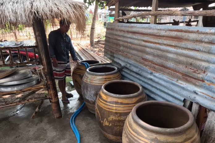ชาวบ้านสะเดา หมู่ที่ 1 ต.สะเดา อ.พลับพลาชัย จ.บุรีรัมย์ กำลังล้างทำความสะอาด โอ่งน้ำและภาชนะใส่น้ำ เพื่อเตรียมรองรับน้ำจากรถเร่ขายน้ำของเพื่อนบ้าน ที่ได้นำรถยนต์กระบะดัดแปลงใส่ถังพลาสติก ขนาดใบละ 200 ลิตร จำนวน 6 ใบ ไปสูบน้ำจากบ่อน้ำต่างหมู่บ้านมาตระเวนส่งขายให้กับชาวบ้าน ที่ได้ติดต่อสั่งซื้อน้ำไว้ก่อนหน้านี้ ในราคาเที่ยวละ 170 บาท ต่อน้ำจำนวน 1,200 ลิตร