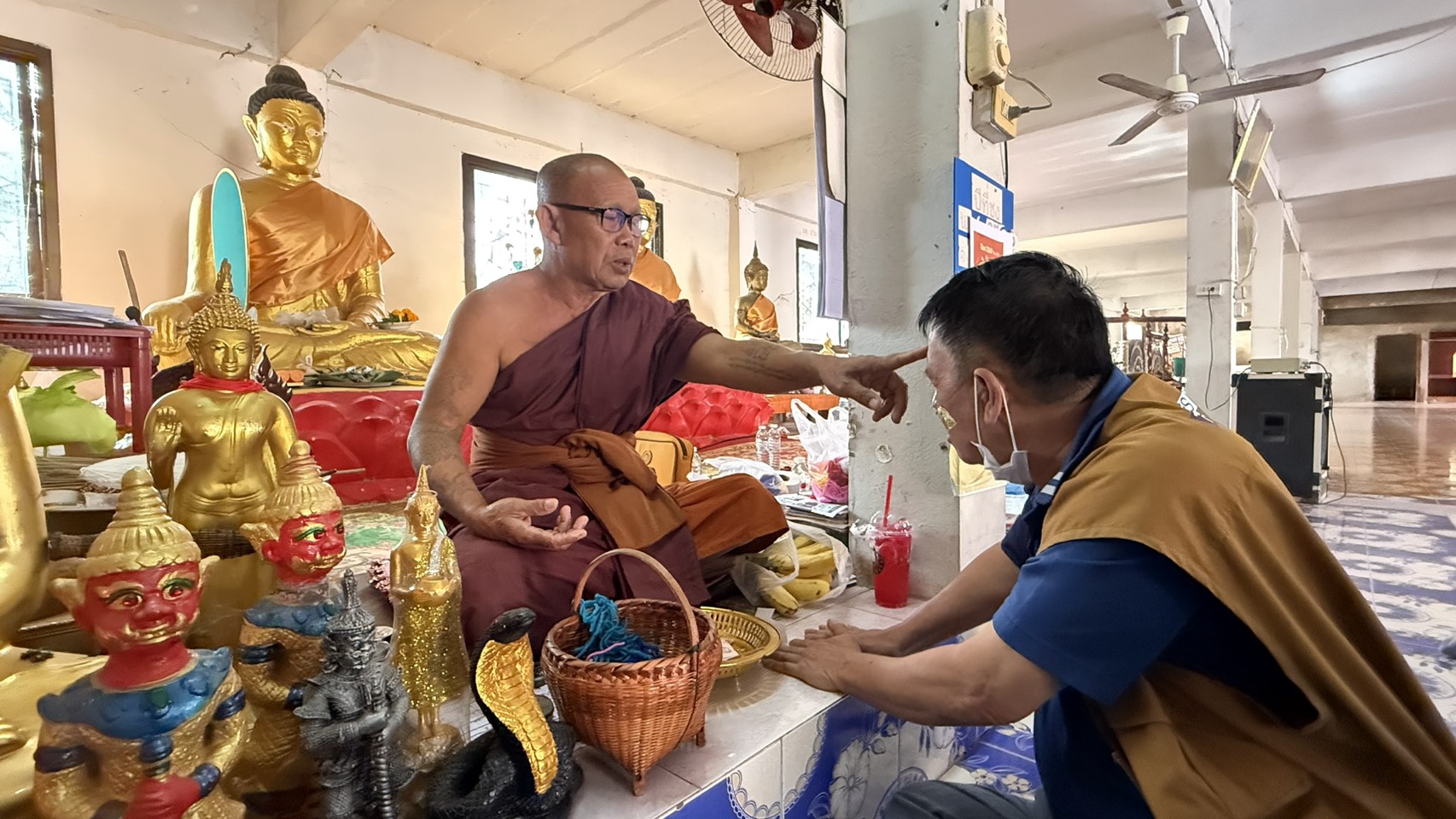 โดยพิธีกรรมเริ่มต้นด้วยการถวาย “ขัน 5” บูชาครู ก่อนที่หลวงปู่จะนำสวดพระพุทธมนต์ ปัดเป่าสิ่งชั่วร้าย และทำพิธี “นอนคลุมผ้าขาว” เพื่อต่อชะตาตามความเชื่อโบราณ ท่ามกลางเสียงเล่าลือถึงปาฏิหาริย์ที่หลายคนเจอกับตัว โดยเฉพาะกลุ่มผู้ป่วยเรื้อรังที่รักษาทางการแพทย์ไม่หาย แต่กลับมีอาการดีขึ้นอย่างน่าอัศจรรย์หลังเข้าร่วมพิธี