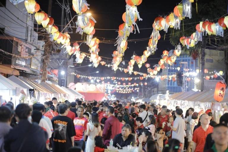 ภายในงานตลอดวันที่ 17–19 กุมภาพันธ์ ลานคนเมืองถูกเนรมิตให้เป็นเทศกาลอาหารและดนตรีสุดยิ่งใหญ่ ถนนสายวัฒนธรรม 3 ชาติพันธุ์ ไทย–จีน–เวียดนาม อัดแน่นด้วยร้านอาหารพื้นถิ่น อาหารมงคล และสินค้า OTOP ขณะที่ไฮไลต์สำคัญคือการผัดหมี่ซั่วแจกจ่ายแก่ผู้ร่วมงาน ตามความเชื่อว่าจะเสริมอายุยืนและความเป็นสิริมงคล
