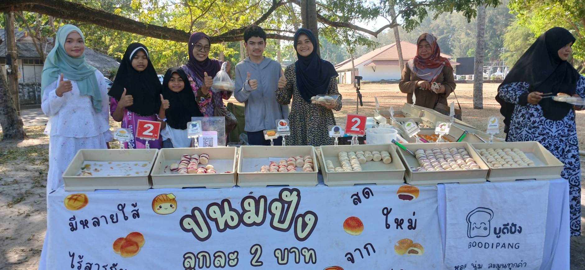 ส่วนขนมปังเรานี้ทำต่อวันหมดแล้วก็หมดเลย วันก็จะผลิตพรุ่งนี้ต่อ ตอนนี้เราขายอยู่ที่หาดนราทัศน์ ส่วนหน้าร้านเราก็ขายอยู่ที่ถนนสมัยอาณาจักร ชื่อร้านบูดีปัง เข้าทางเพจ.บูดีปังได้ หรือว่าติ้กต้อก นานาขนมปังจิ๋วและเบอร์ 0817987174 แต่ละวันเราผลิตอยู่ที่5,000ชิ้น เพราะว่าเราจะมีออเดอร์อื่นที่ประจำอยู่แล้ว ขายชิ้นละ2 บาททุกไส้ทุกชิ้น สามารถเลือกไส้ได้เลยทั้ง25 ไส้
